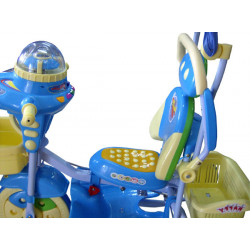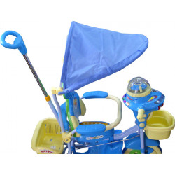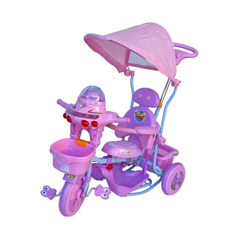 Wielofunkcyjny rowerek trójkołowy z daszkiem.