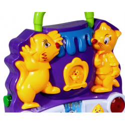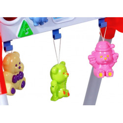 Stojak Fitness 668-43 ML. Zabawi dziecko trzema zawieszonymi grzechotkami, oraz dwoma światełkami migajacymi podczas odtwarzania melodyjek i odgłosów zwierząt.