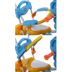 Dodatkowo istnieje możliwość złożenia podnóżka, dla dzieci, które mogą już same pedałować. Solidne piankowe kółka jeszcze bardziej zwiększają stabilność rowerka. W zestawie daszek chroniący dziecko przed słońcem oraz regulowany prowadnik do sterowania rowerkiem przez rodzica. Łatwy w montażu.